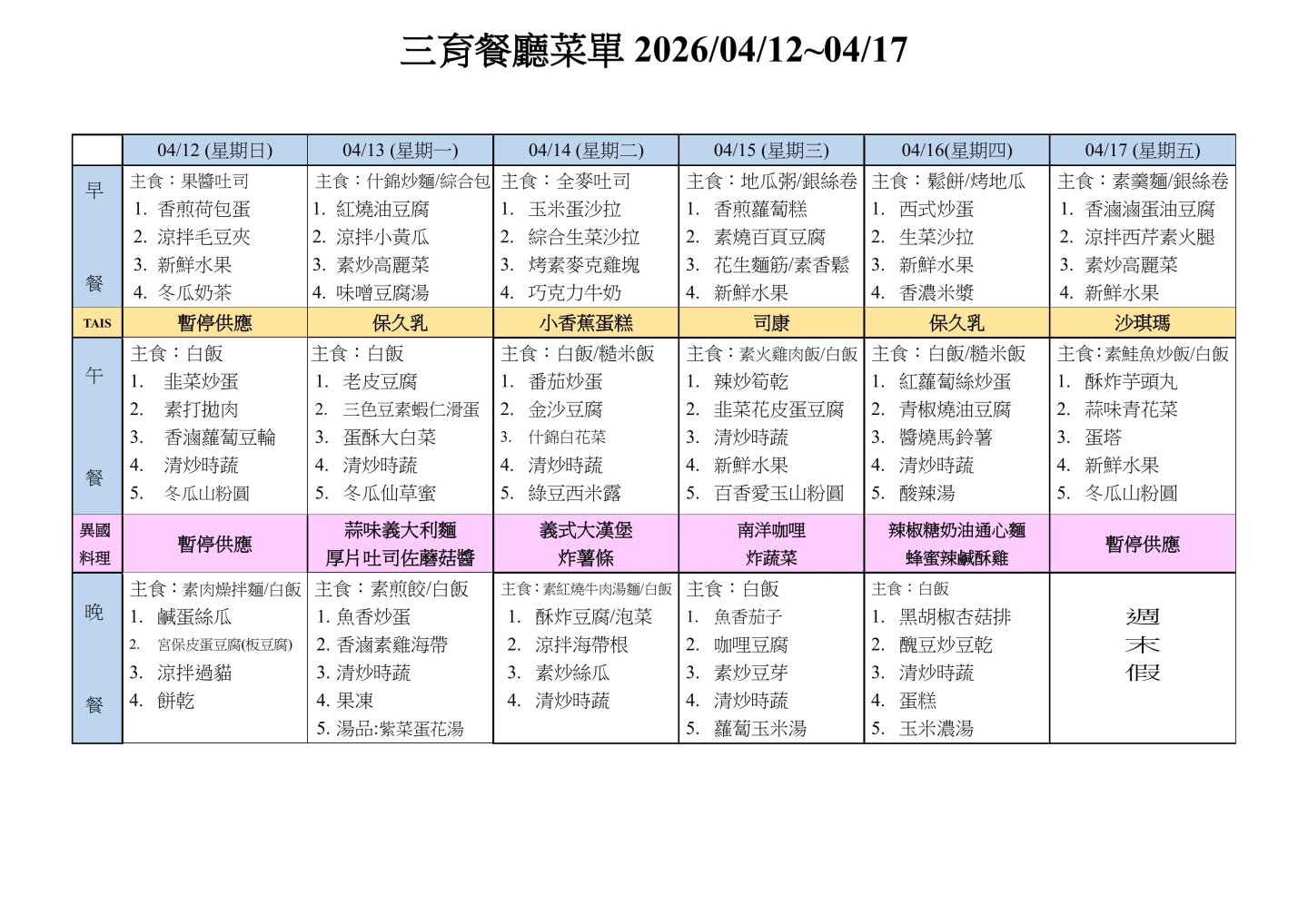 本週菜單請參考下面圖片: